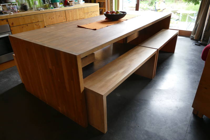 Deze tafel in gelamineerde eik en beuk is gemaakt van gerecupereerde beschadigde keukentabletten.